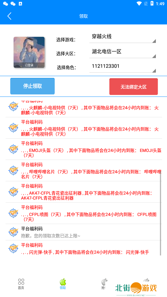 绑定大区后!点击领取道具按钮!再点领取按钮即可!一键高速领取装备!活动多的时候更能领取到几十几百件武器装备!免去各种繁琐的过程!真正实现无人自动化!!