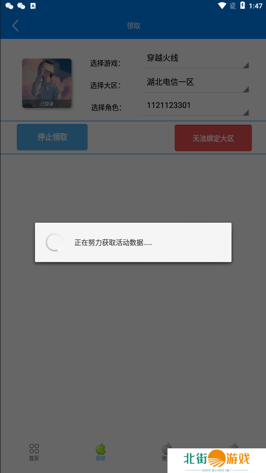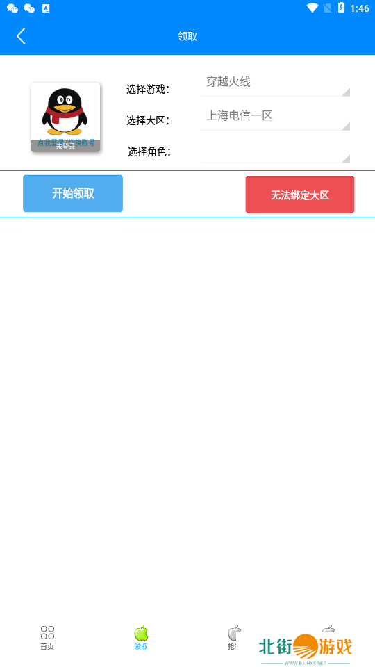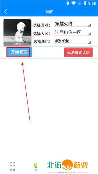 2、登陆过后,玩家可以选择区服,选择游戏角色,然后点击开始领取就可以自动开始领取游戏道具了;