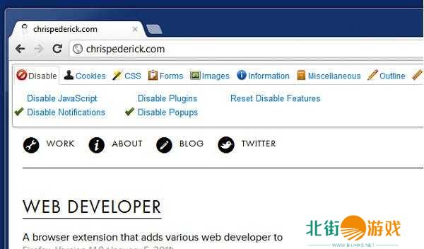 1.Disable禁用工具 可以暂时的屏蔽当前页面中的某些东东,如Ja vaScript脚本、缓存、mete自动重新定向、将网页显示为黑色(图片除外)、禁用弹窗等等。如下图:
