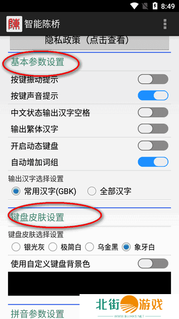 4、在设置界面,可以设置基本参数,键盘皮肤设置。