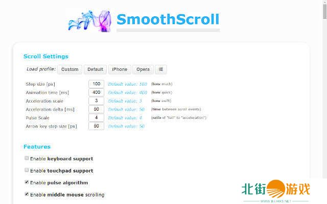 在此页面中,SmoothScroll提供了多种环境下的鼠标滚动配置,如:iPhone、Opera、IE,你可以从中选择任意配置。